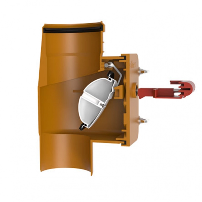 Система запирания обратного клапана представляет собой однокамерный механический затвор с запирающей заслонкой. Под давлением обратного подпора в канализационной сети заслонка всплывает и перекрывает канализационную магистраль.
