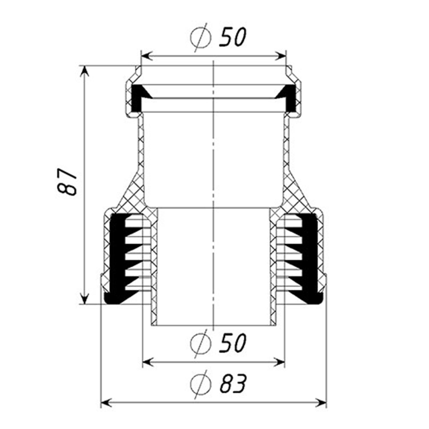 Переходник ТП-9/50 предназначен для соединения канализационного оборудования и труб из ПП, ПВХ или ПЭ с безраструбными чугунными, стальными трубами.
