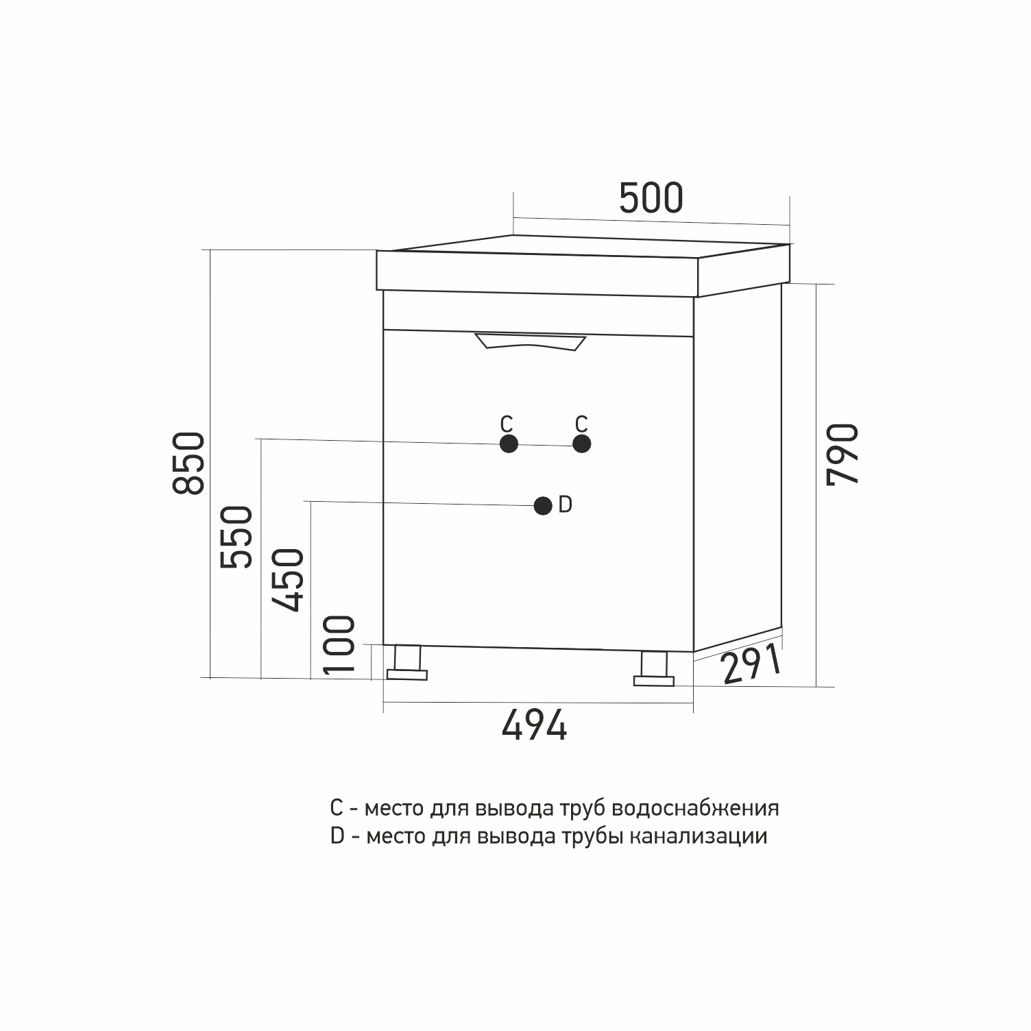 Размеры указаны для готового изделия в сборе с учетом раковины, тумбы и ножек.