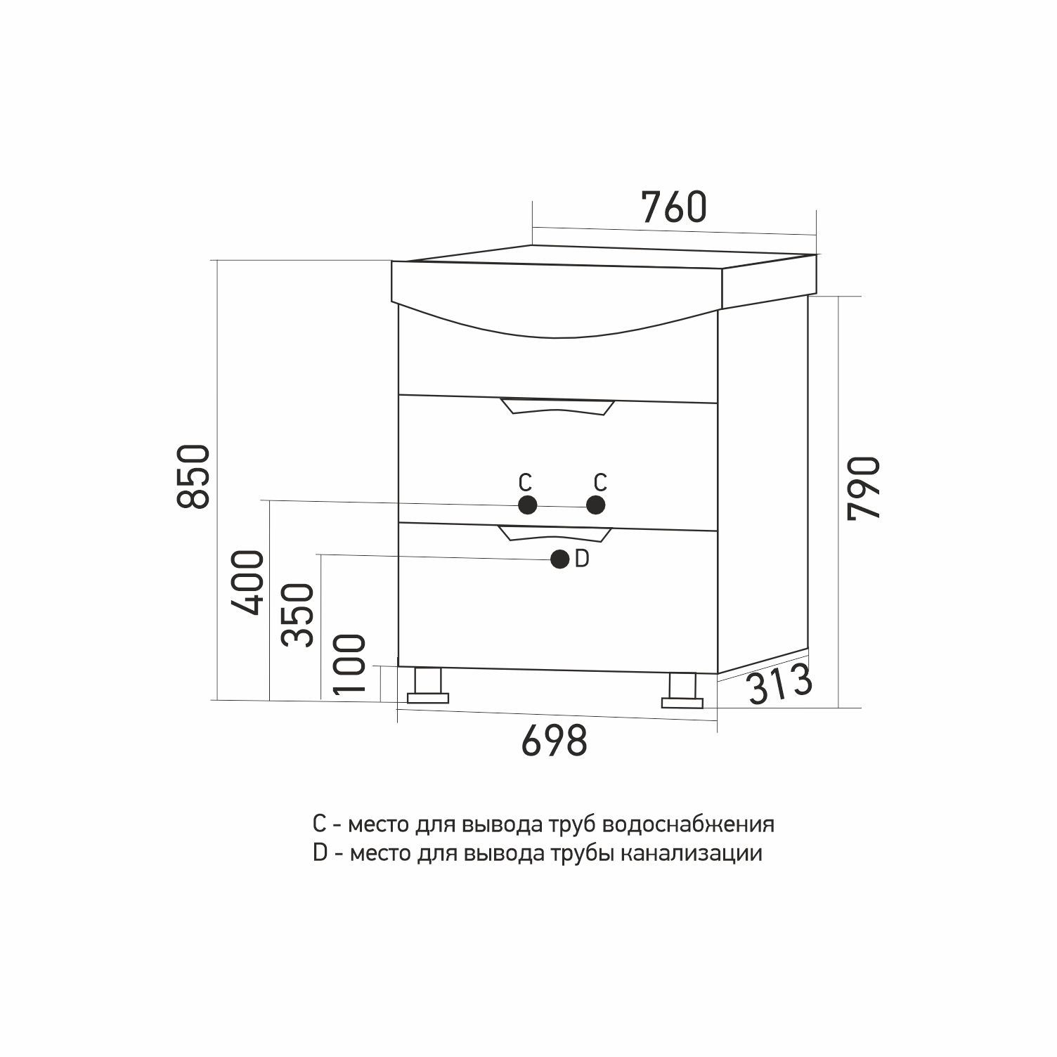 Размеры указаны для готового изделия в сборе с учетом раковины, тумбы и ножек.