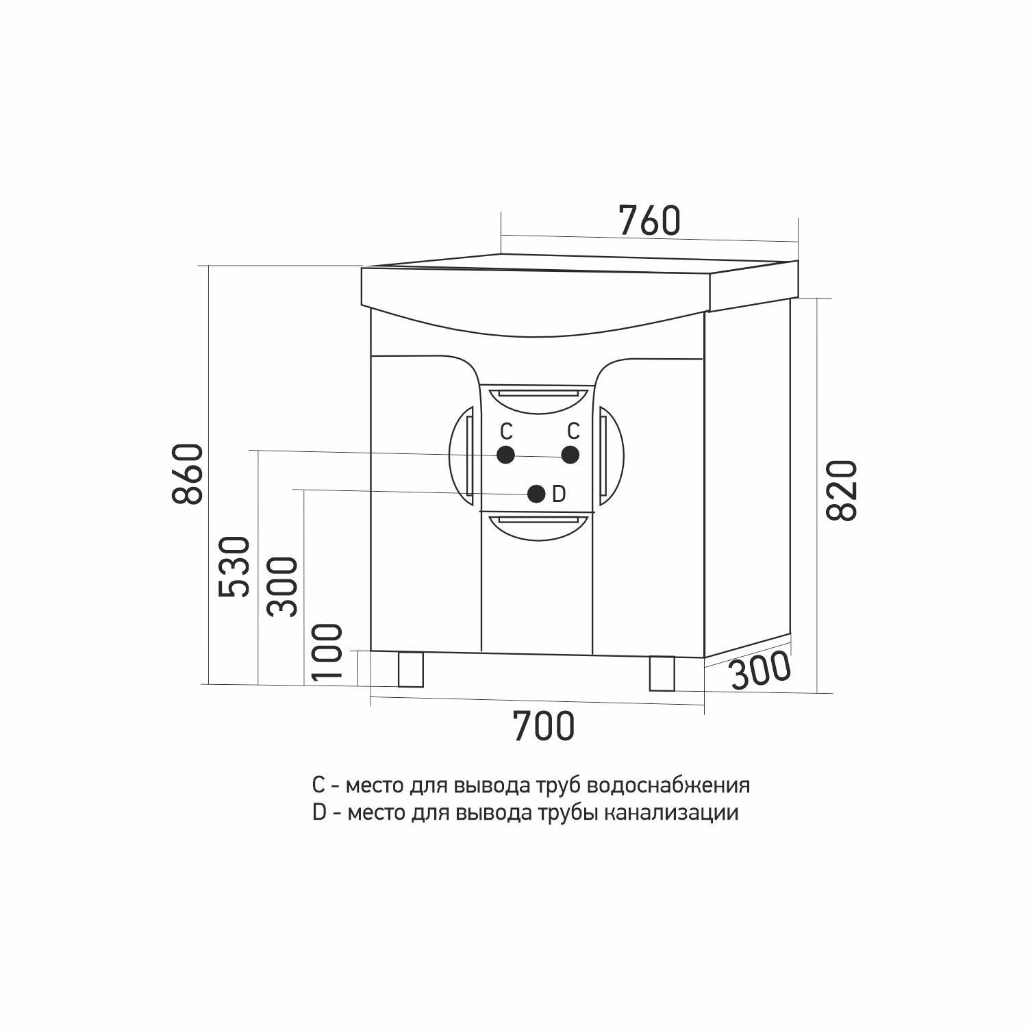 Размеры указаны для готового изделия в сборе с учетом раковины, тумбы и ножек.