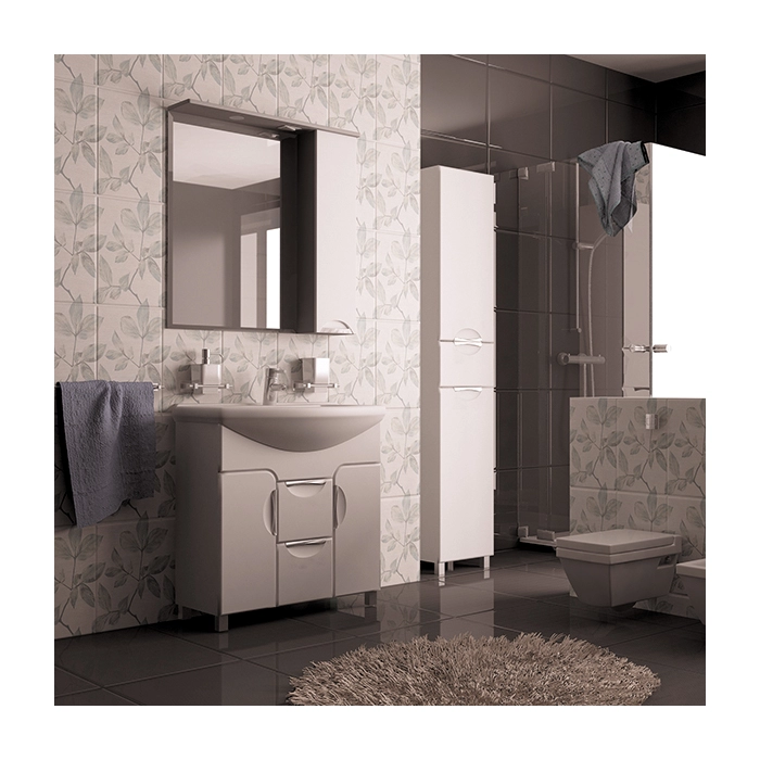 Этот комплект мебели с оригинальным дизайном. Знаковой фигурой является тумба с геометрическими линиями на фасаде. Хорошо подобранная фурнитура усиливает эффект четких прямых линий и формирует правильный квадрат в центре.