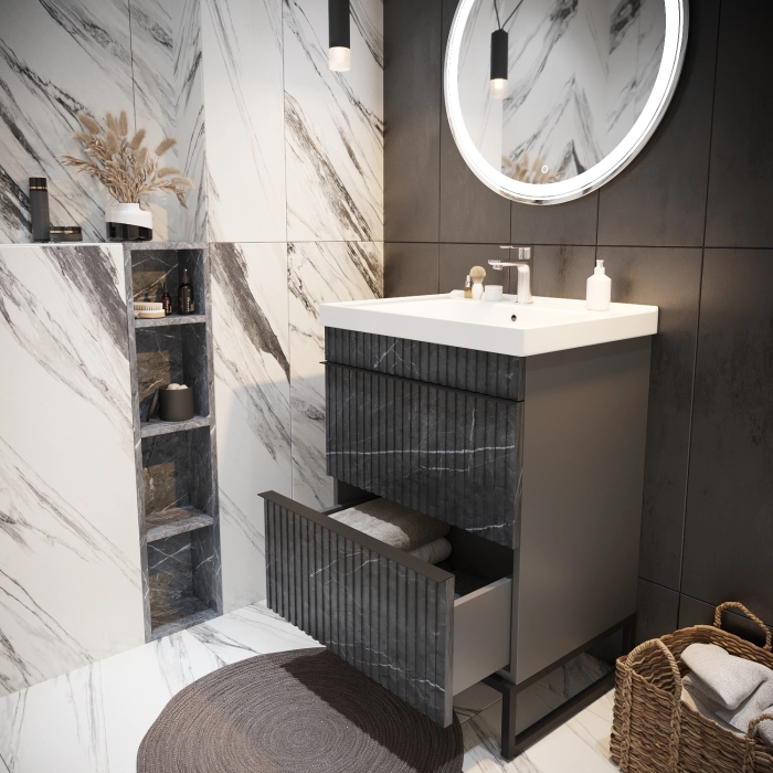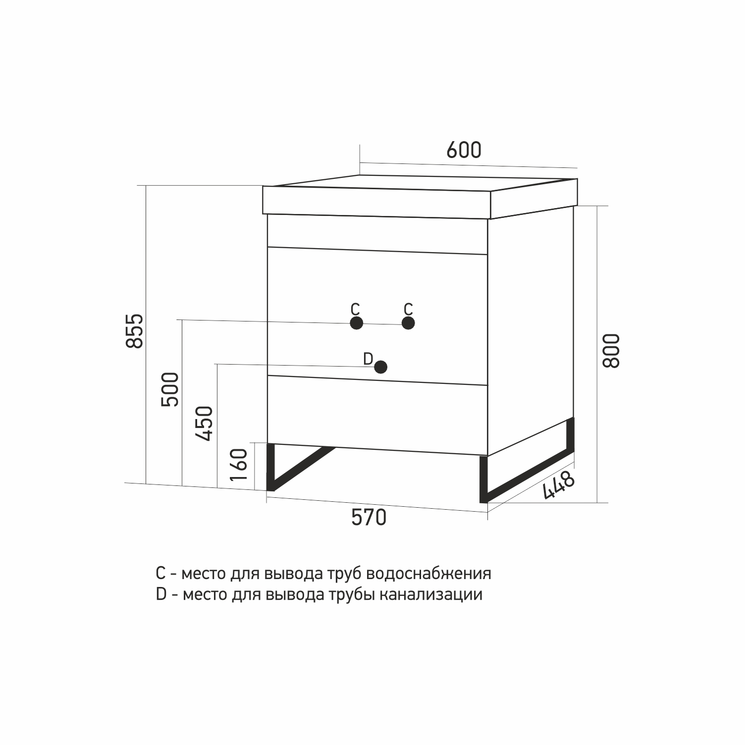 Размеры указаны для готового изделия в сборе с учетом раковины, тумбы и ножек.