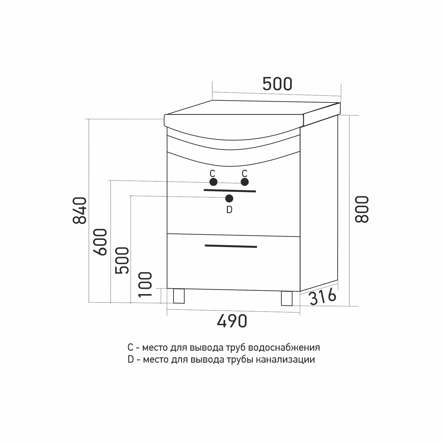 Размеры указаны для готового изделия в сборе с учетом раковины, тумбы и ножек.