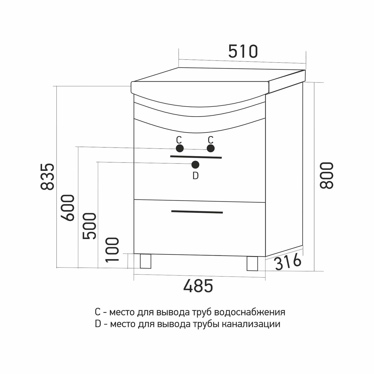 Размеры указаны для готового изделия в сборе с учетом раковины, тумбы и ножек.